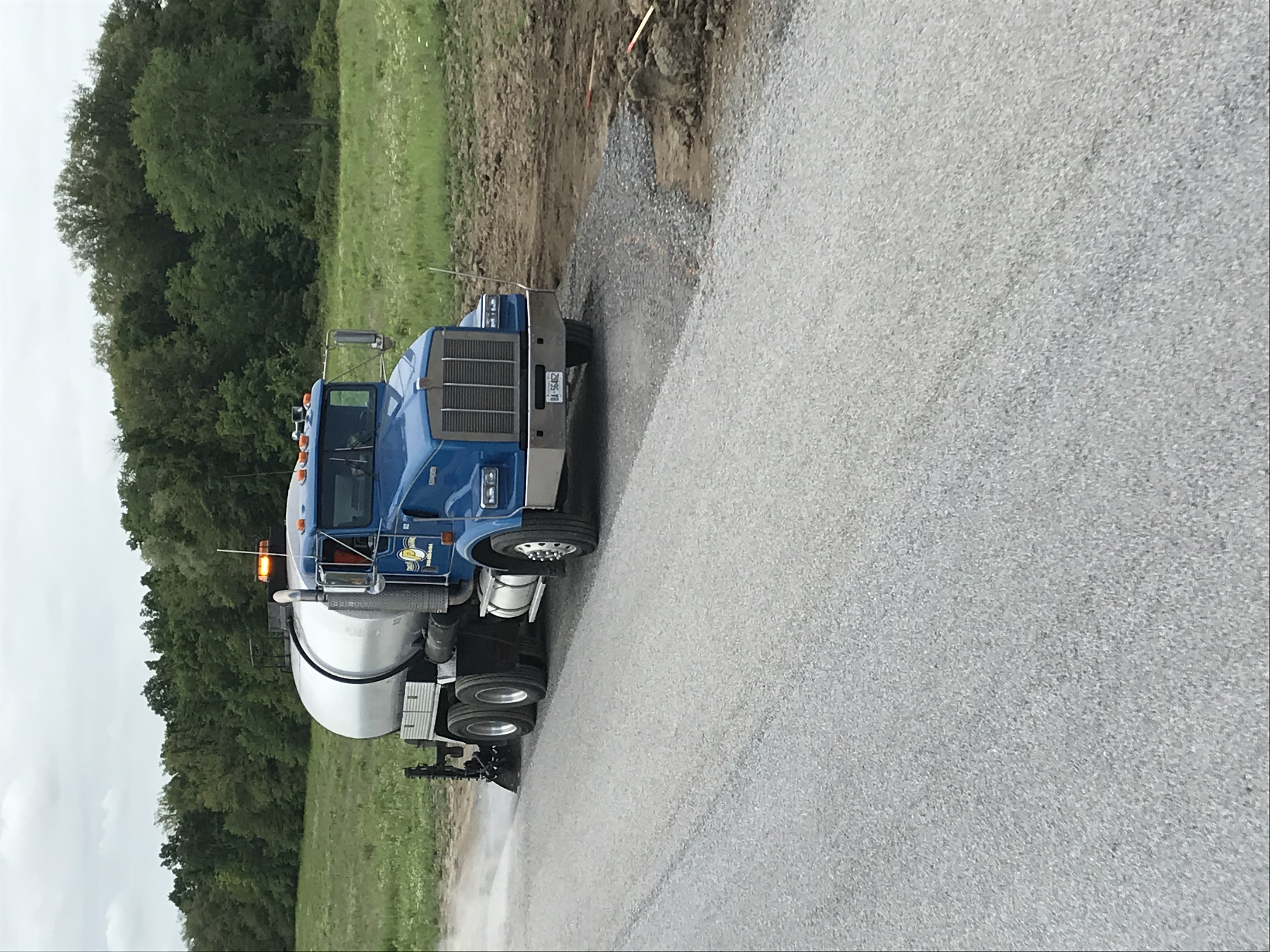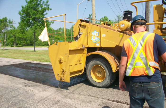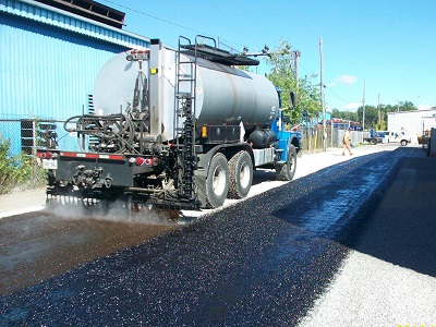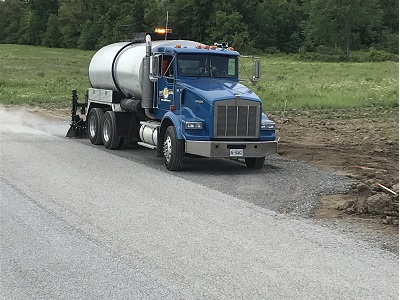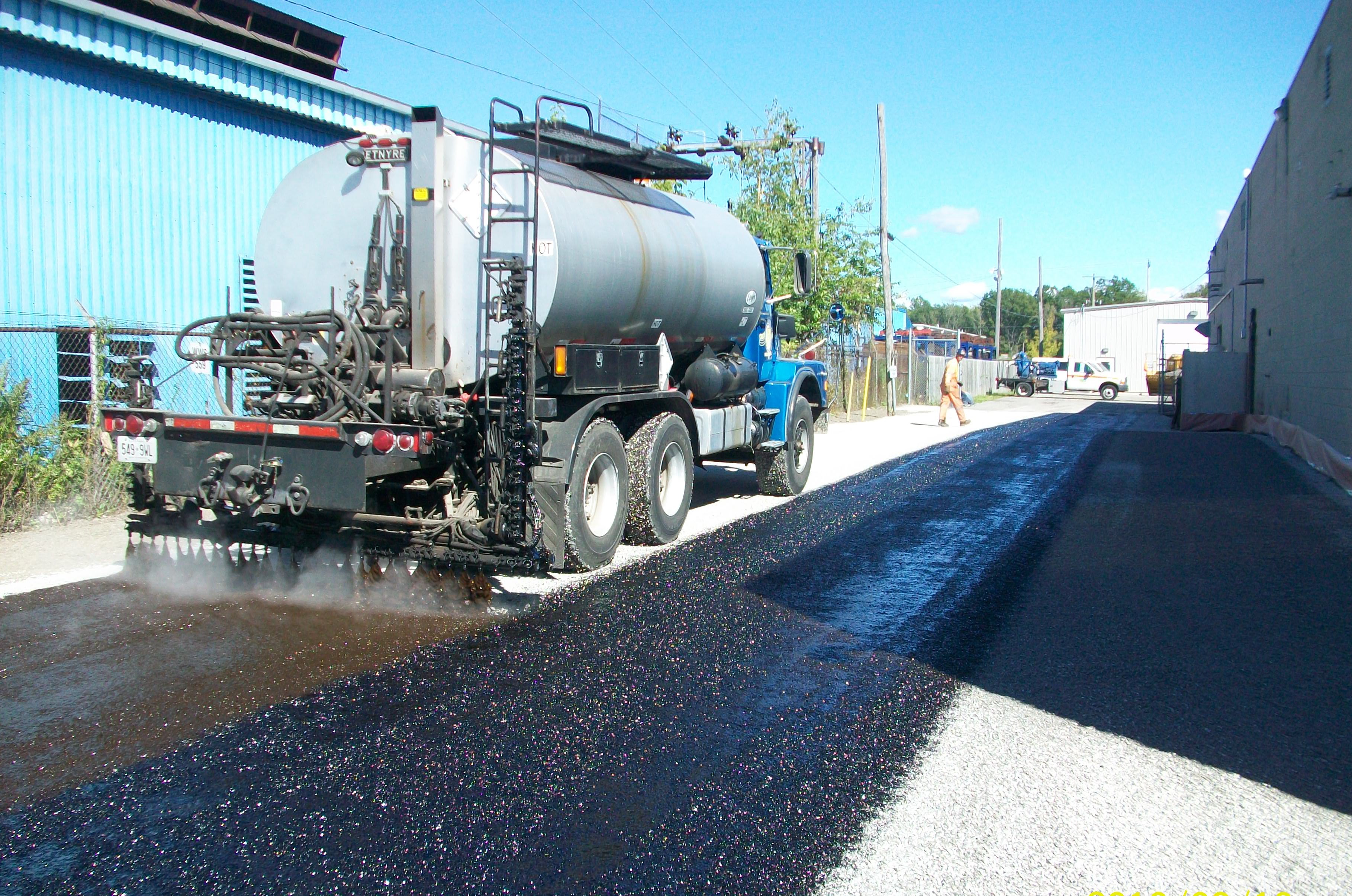 Asphalt emulsion is a mixture of water, asphalt cement and an emulsified agent. It is applied with a computerized distributor truck, followed by stone application placed through a computerized chip spreader.