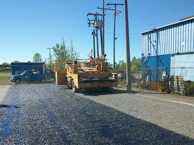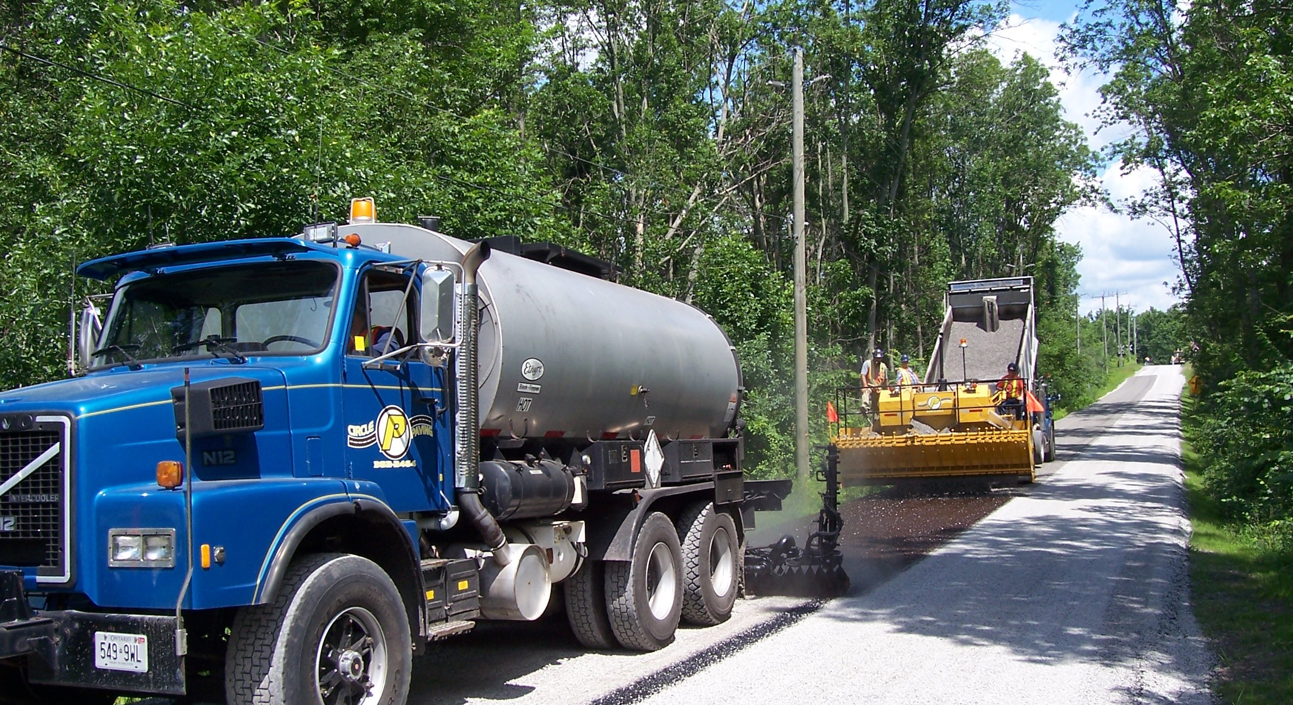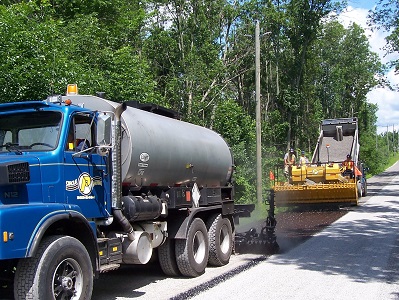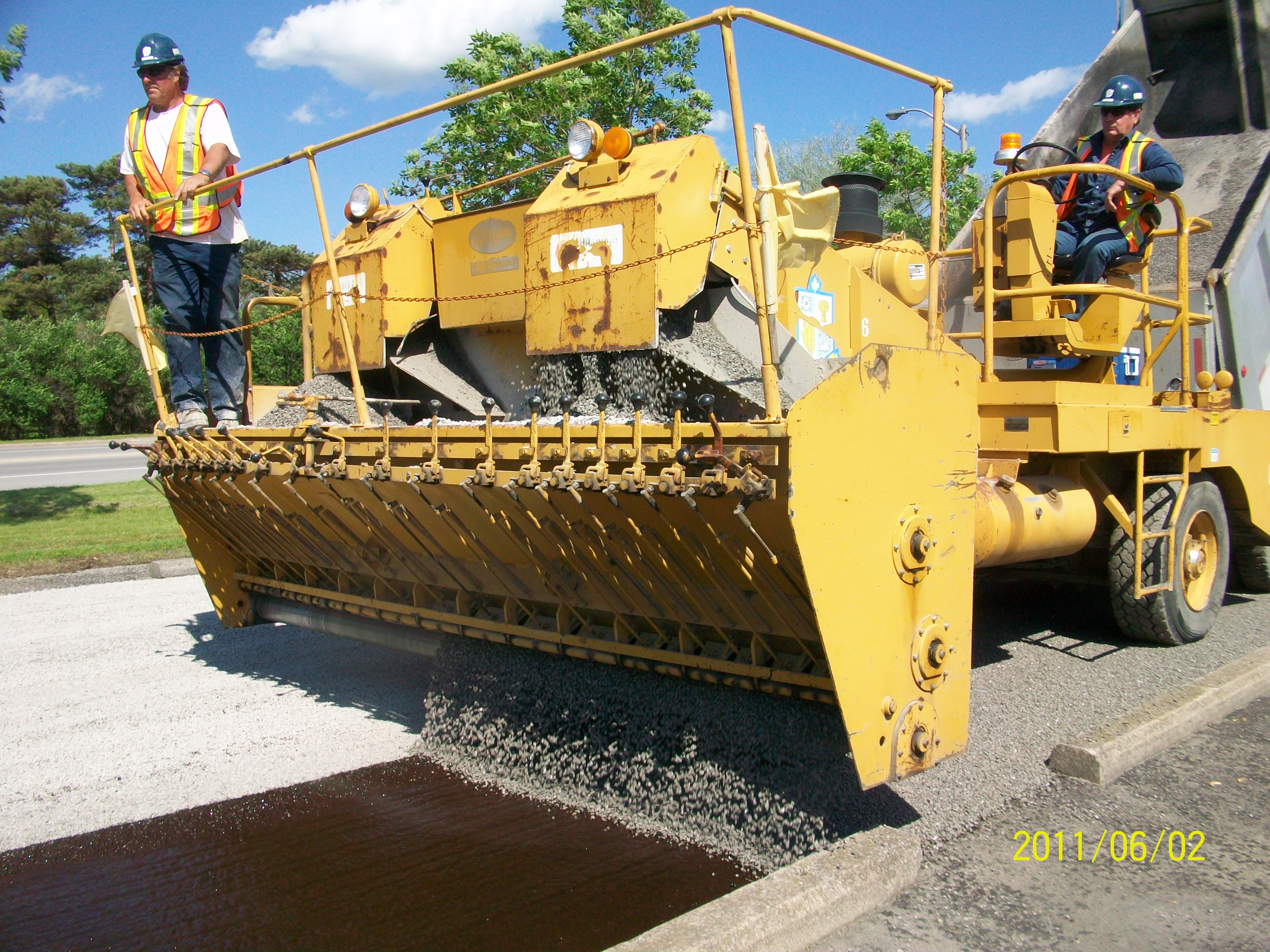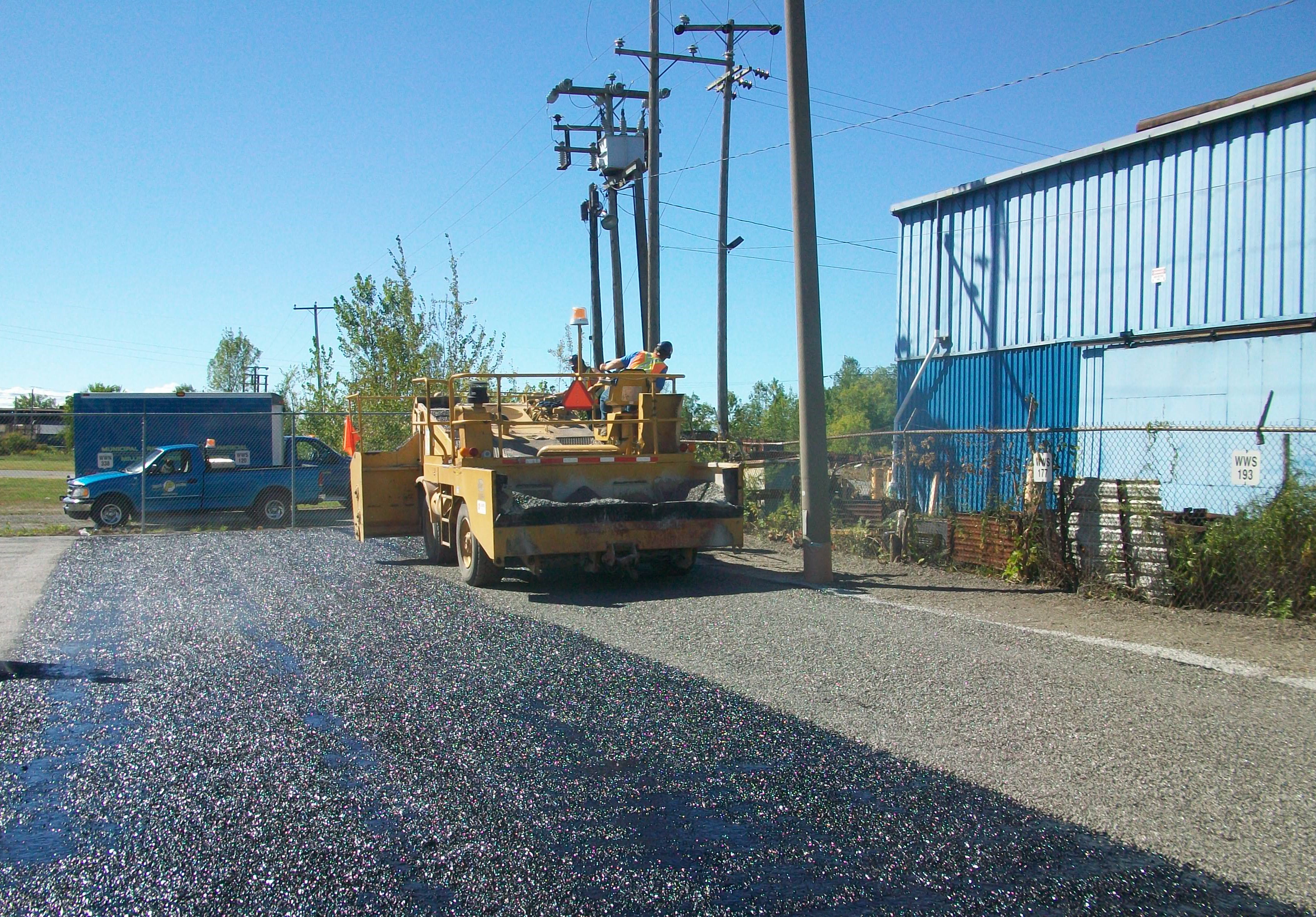 Asphalt emulsion is a mixture of water, asphalt cement and an emulsified agent. It is applied with a computerized distributor truck, followed by stone application placed through a computerized chip spreader.