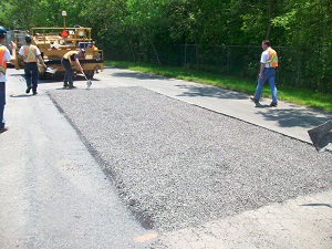 The process consists of fine grading and compacting the stone base and the application of a layer of emulsion and a 3/8” clear stone that is rolled. A second application of emulsion and chip stone is then immediately placed over the first. After an initial period of cure time (usually two weeks), loose aggregate is swept off the freshly surfaced road. Finished results, provide a stabilized road or parking lot surface that is considerably less in cost than conventional asphalt paving.